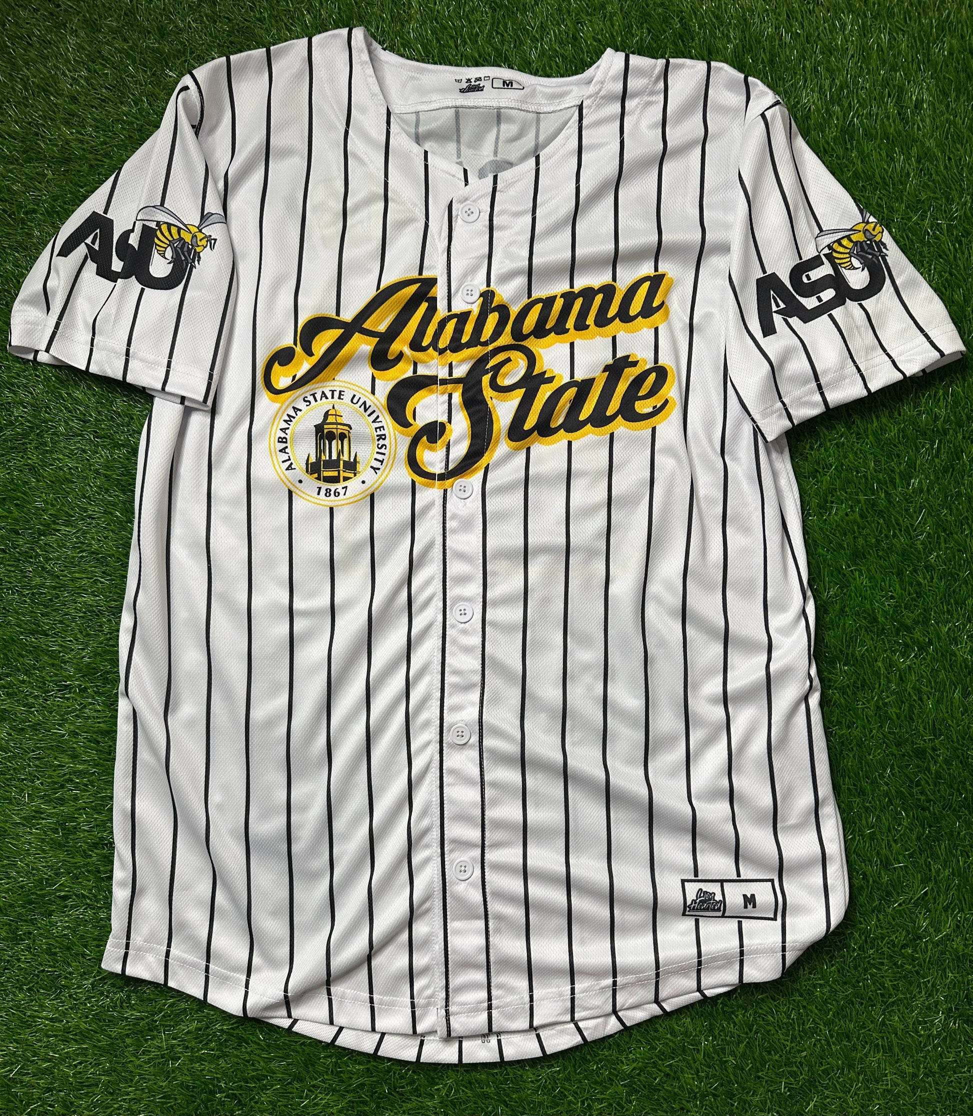 Rep your Hornet pride in style with the exclusive Alabama State University Pinstripe Baseball Jersey. Designed for comfort and standout spirit, this jersey blends classic pinstripe detailing with bold ASU branding that commands attention on game days, tailgates, and campus events.